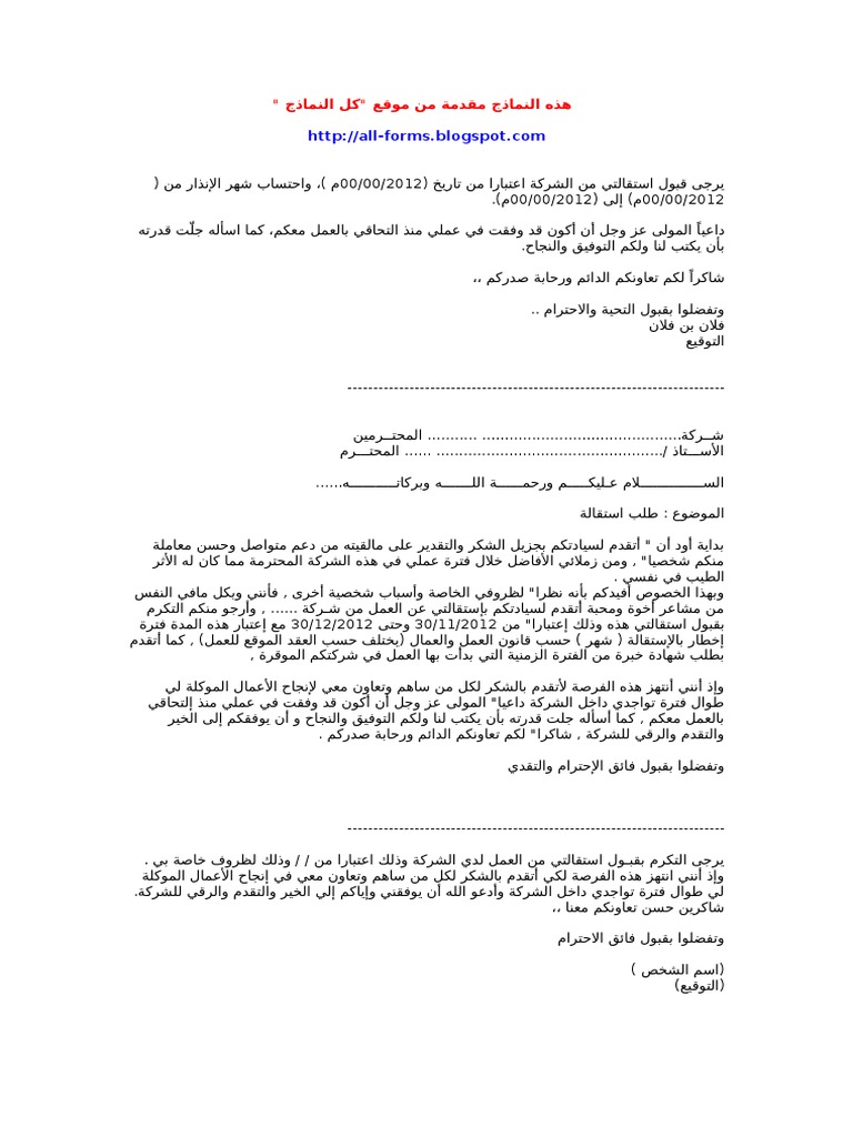 نموذج استقالة من شركة جاهز للطباعة موقع الجنة