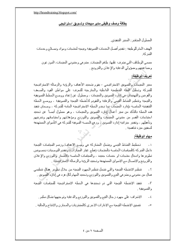 بطاقة وصف وظيفي مدير مبيعات وتسويق استراتيجي Pdf