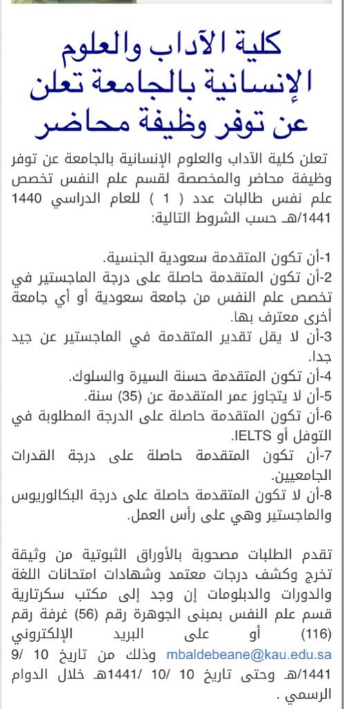 وظائف أكاديمية A Twitter جامعة الملك عبدالعزيز تعلن عن توفر وظيفة أكاديمية شاغرة للنساء محاضر تخصص علم نفس Https T Co U2rkraribm