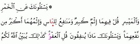 ي س أ ل ون ك ع ن ال خ م ر و ال م ي س ر ق ل ف يه م ا إ ث م ك ب ير و م ن اف ع ل لن اس و إ ث م ه م ا أ ك ب ر م ن ن ف ع ه م ا و ي س أ ل ون ك م اذ ا ي ن ف ق ون ق ل ال ع ف و ك ذ ل ك ي ب ي ن الل ه ل ك م ال آي ات ل ع ل ك م